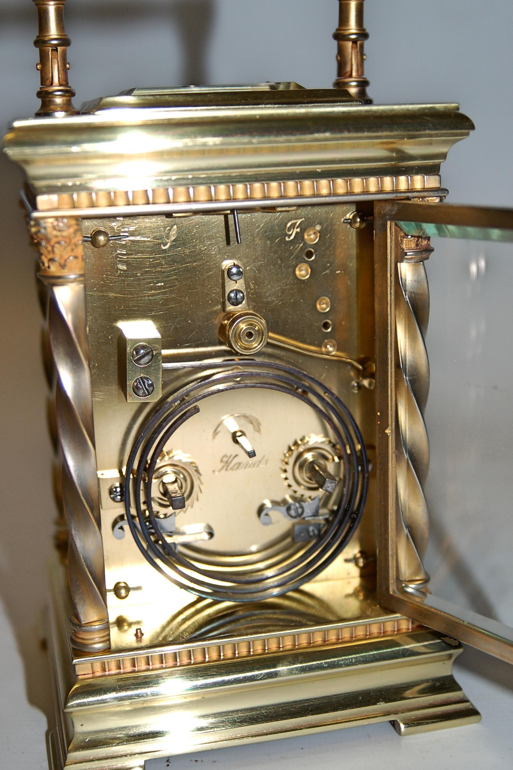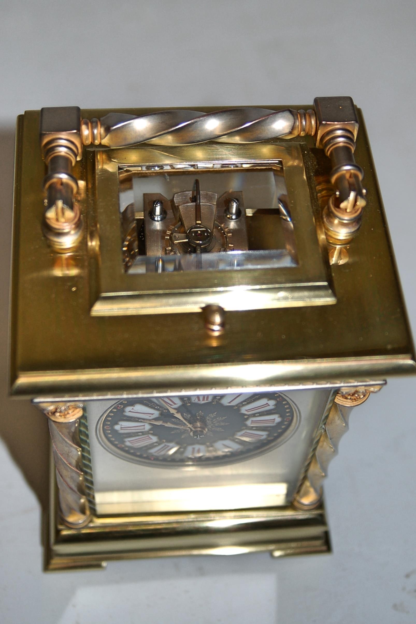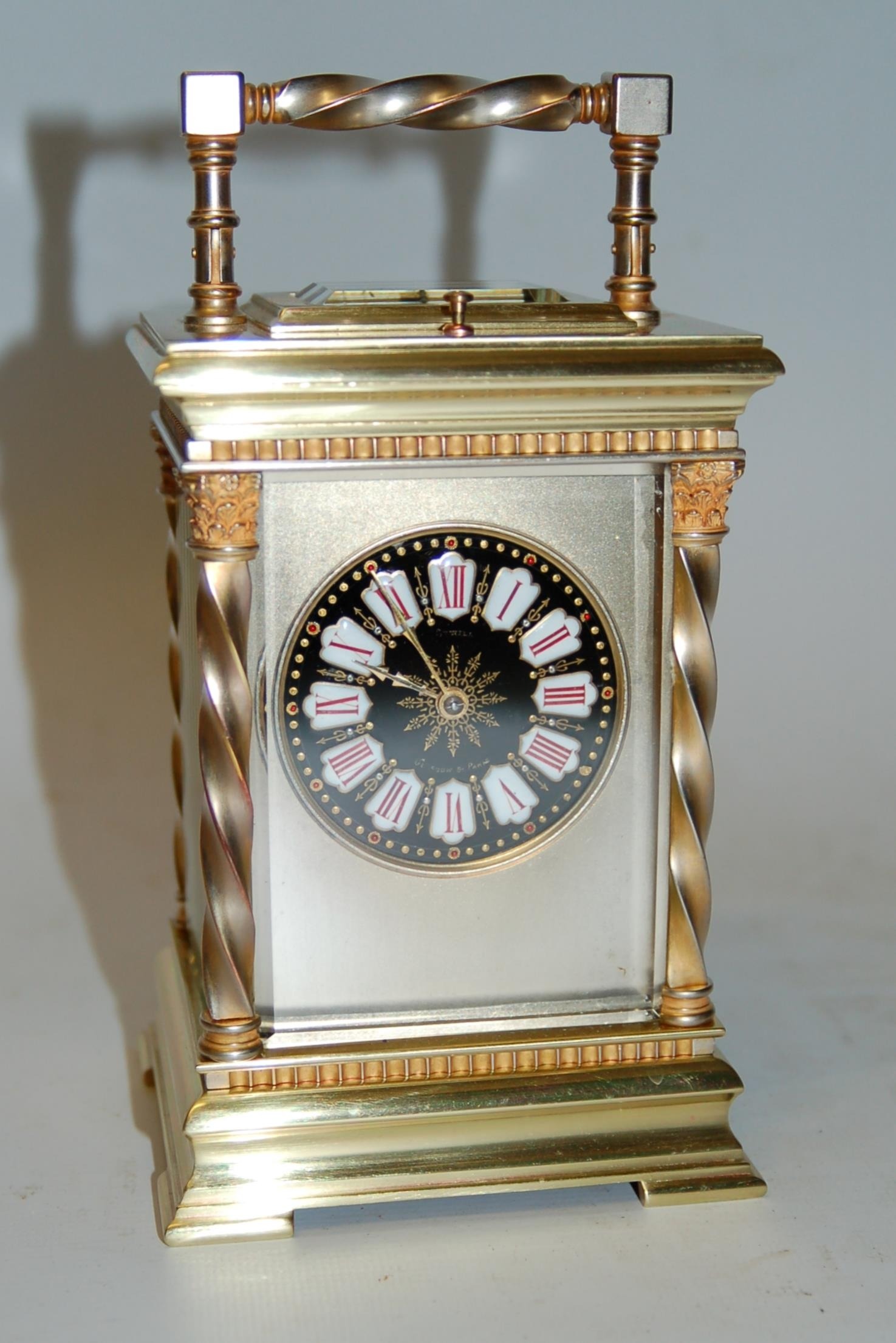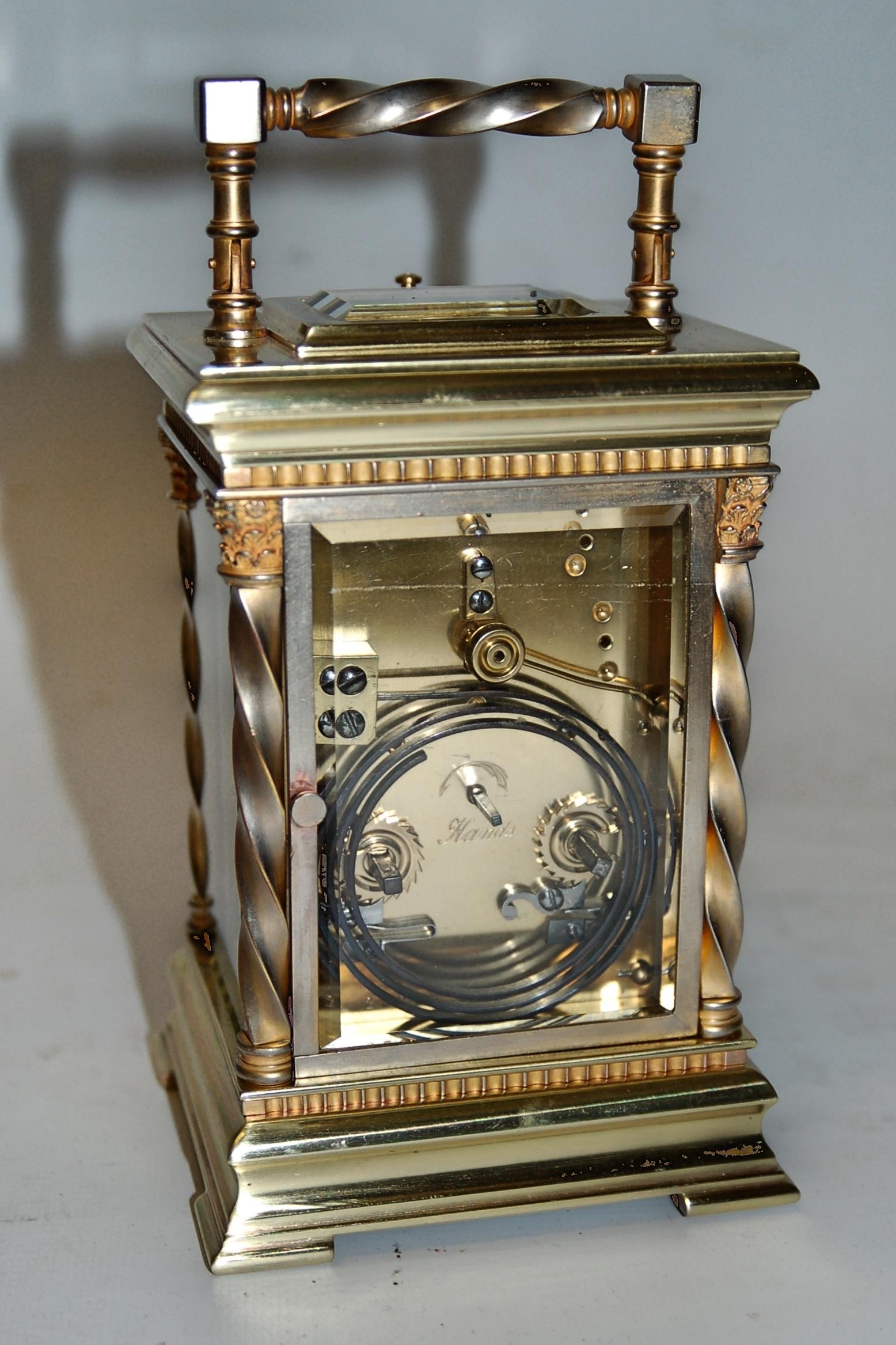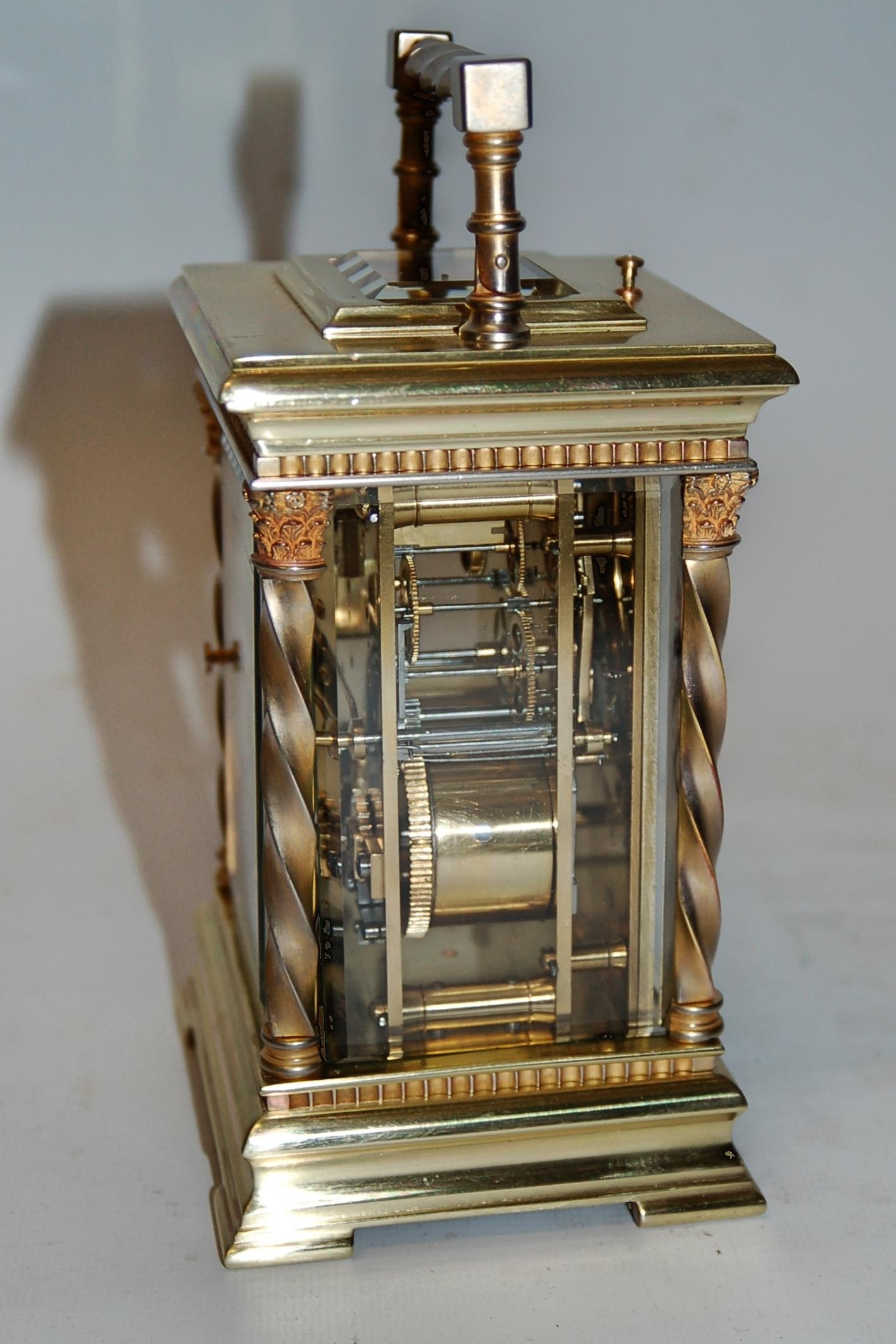 A fine condition and quality ‘8-day’ brass carriage clock with porcelain coloured dial and Roman Numerals.