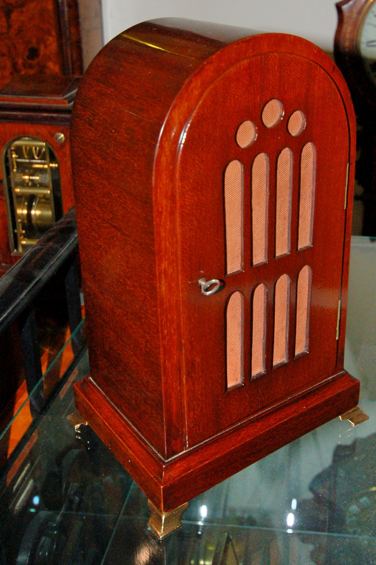 The lovely design mahogany dome top cabinet with inset brass moulding to the front, standing on brass bracket feet and a lovely design rear case door.