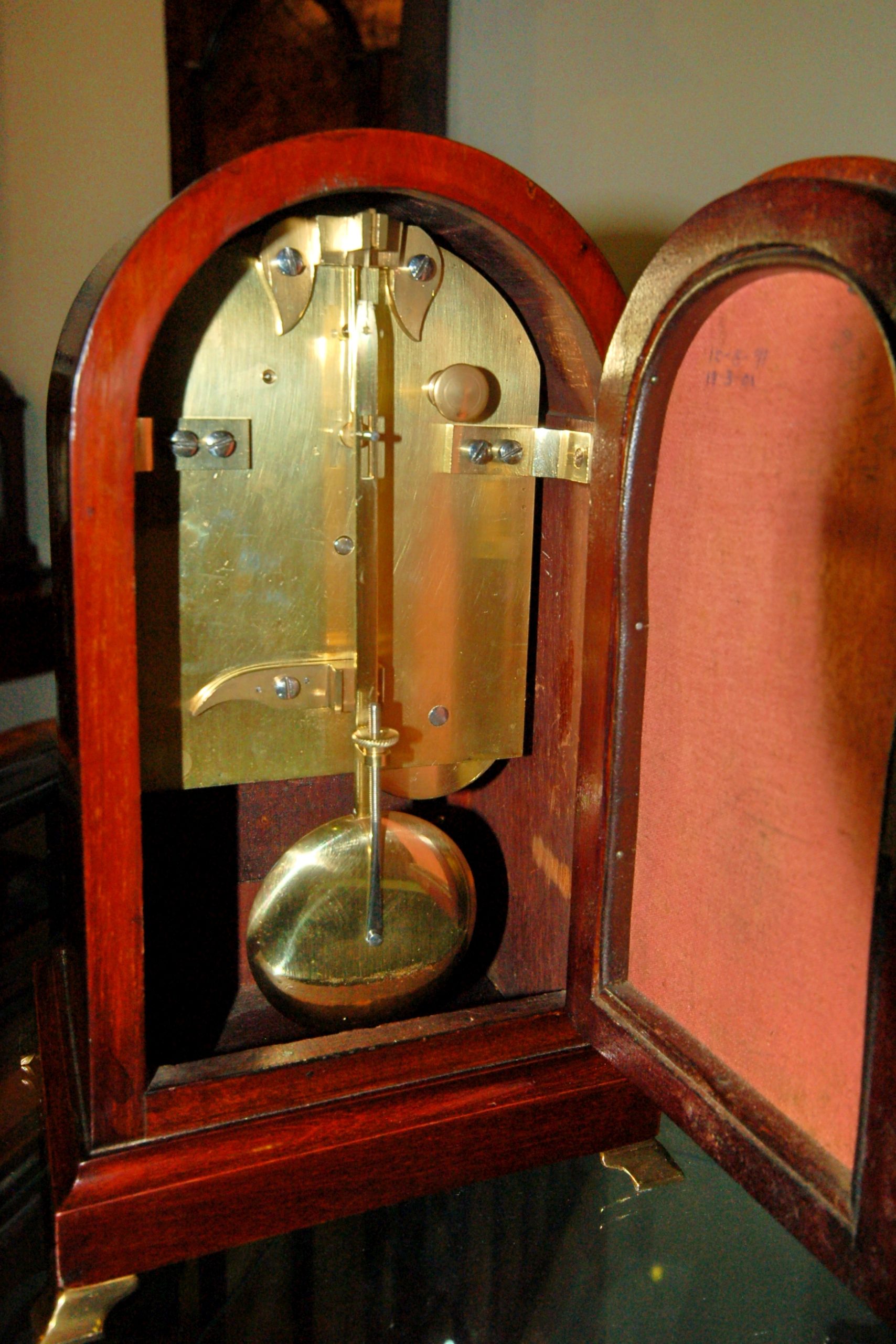 The small white painted convex dial with Roman numerals and the makers name shown to the top.