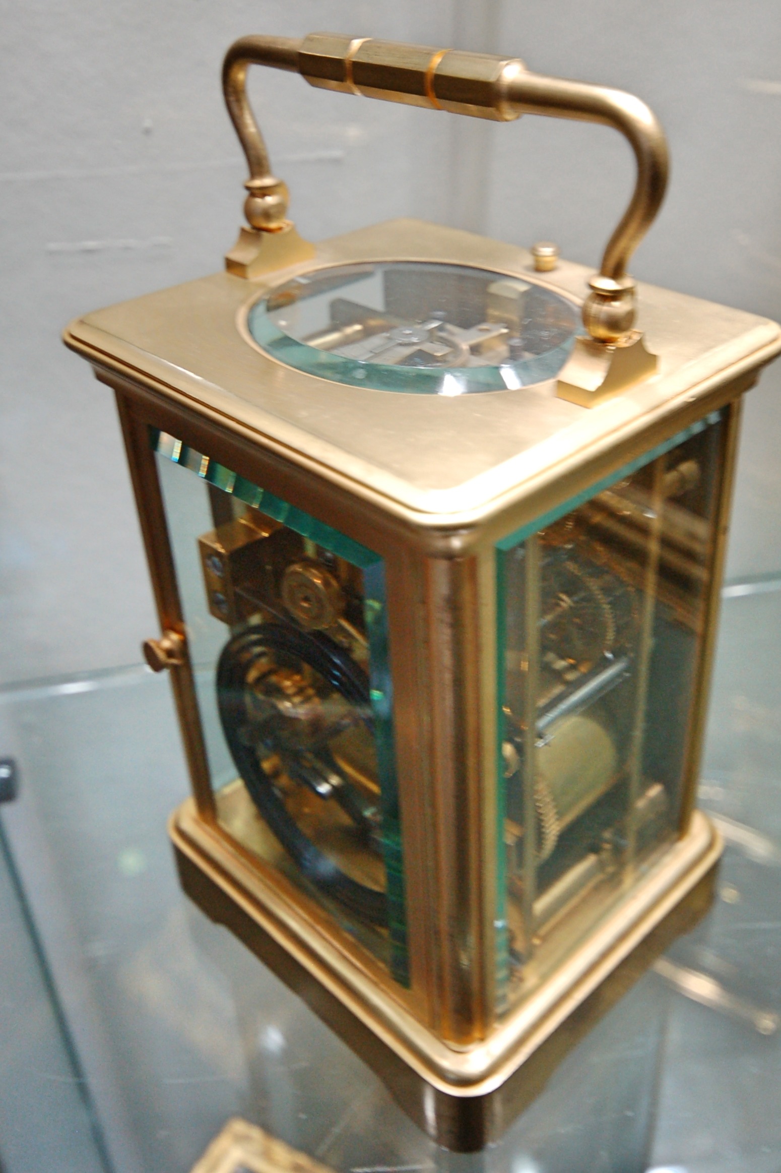 A lovely elegant Victorian French carriage clock with hour and half hour strike on a gong and repeat function. Spring driven platform lever escapement of 8 day duration. Silvered brass dial with Roman numerals. The clock retailed by Aitchison to the Queen. Fine quality 5 glass case with brass carrying handle.