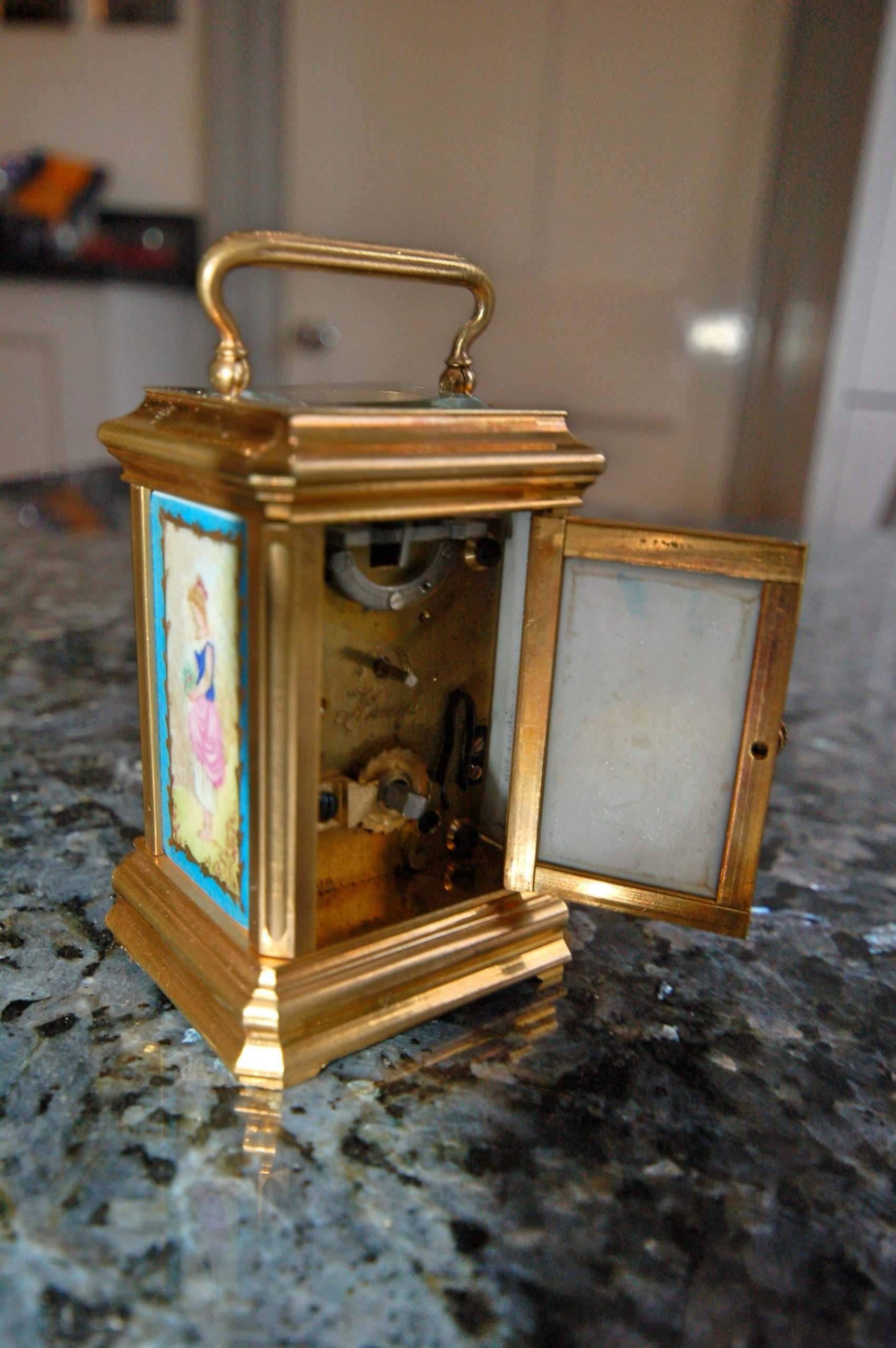 A fine ‘8-day’ miniature timepiece carriage clock with brass case with inset enamel panels.