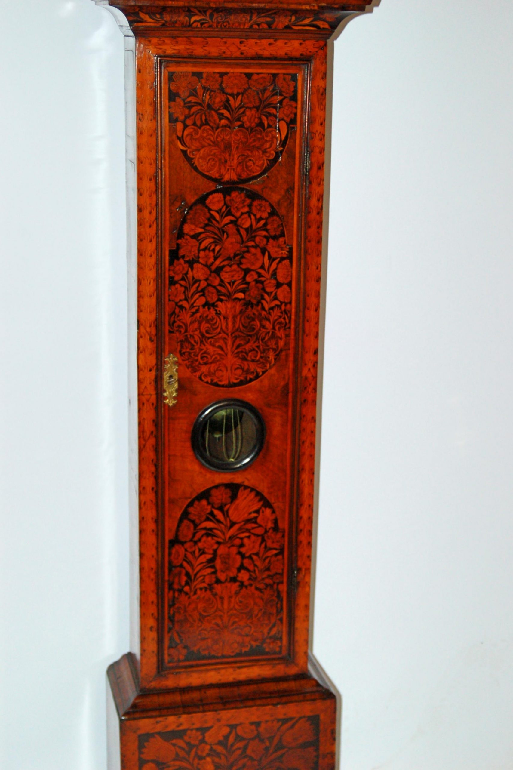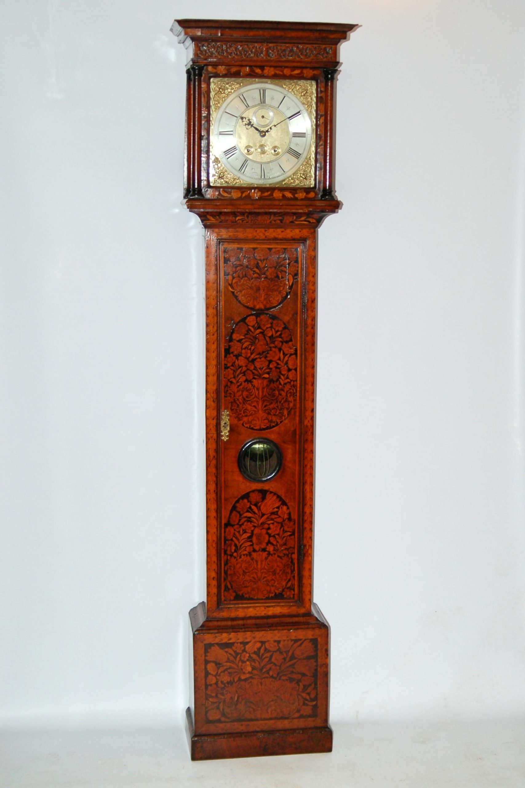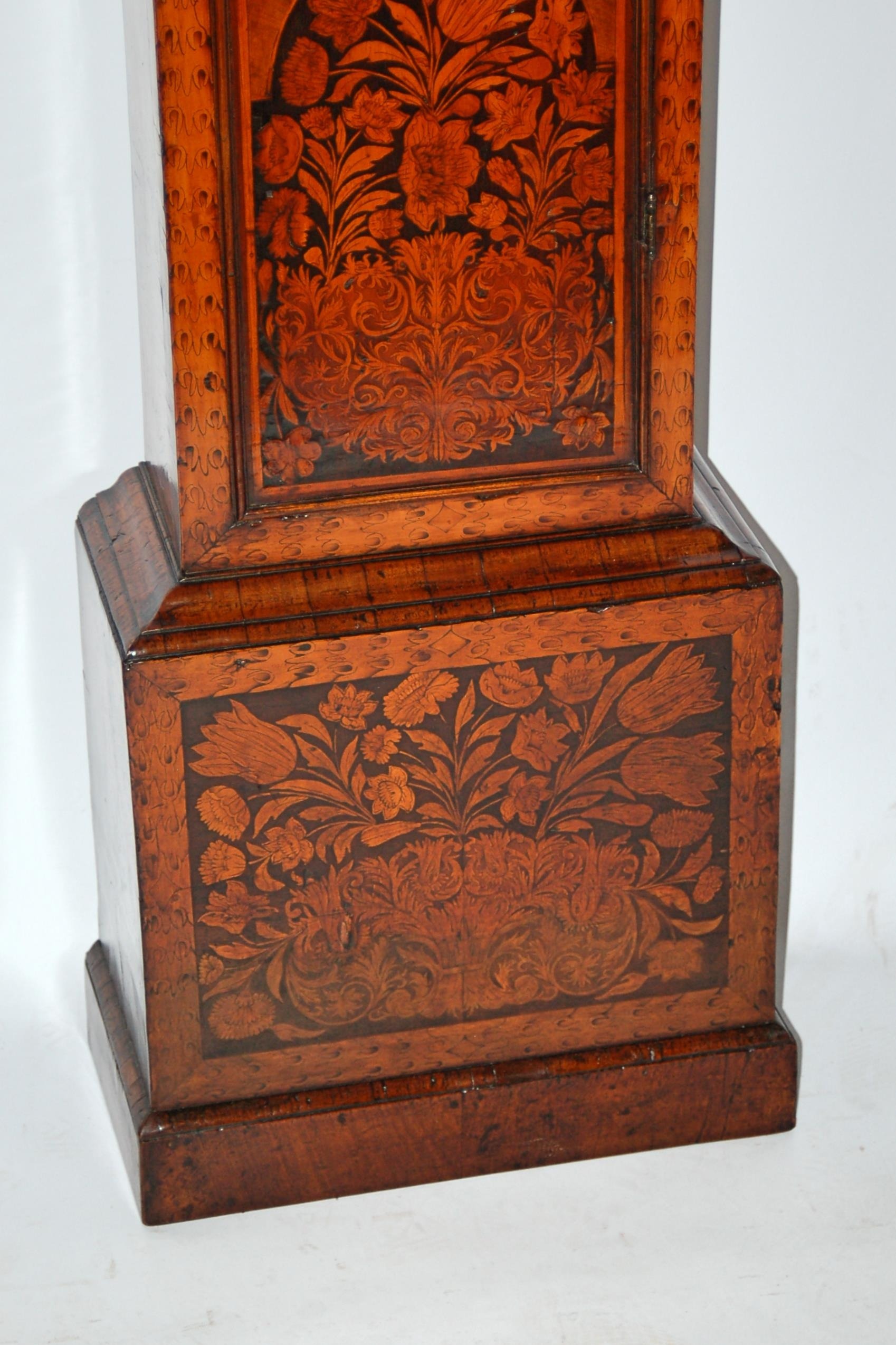 The outstanding quality walnut cabinet showing finely decorated marquetry case. Moulding and glass lentical to the trunk door.The cabinet standing on a single plinth. The case of superb colour and patination. A fine collector’s clock.
