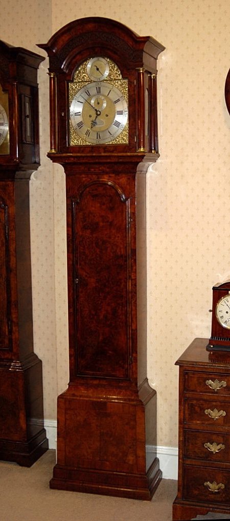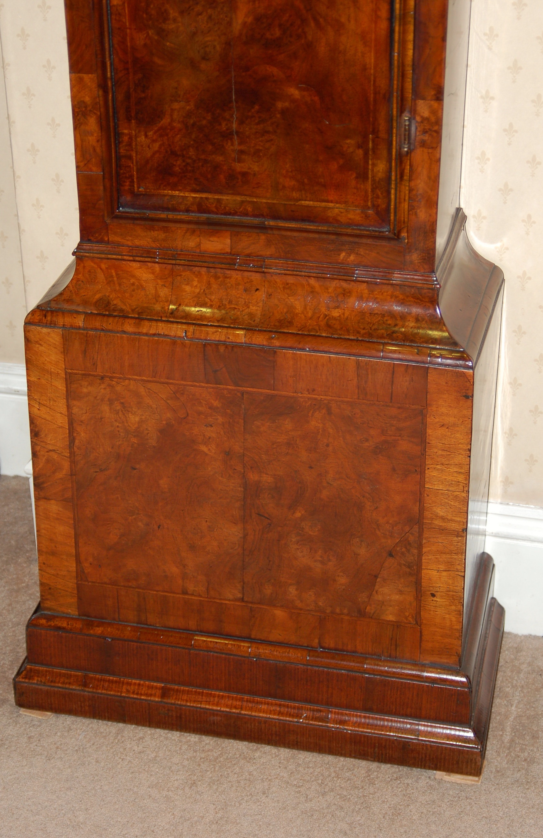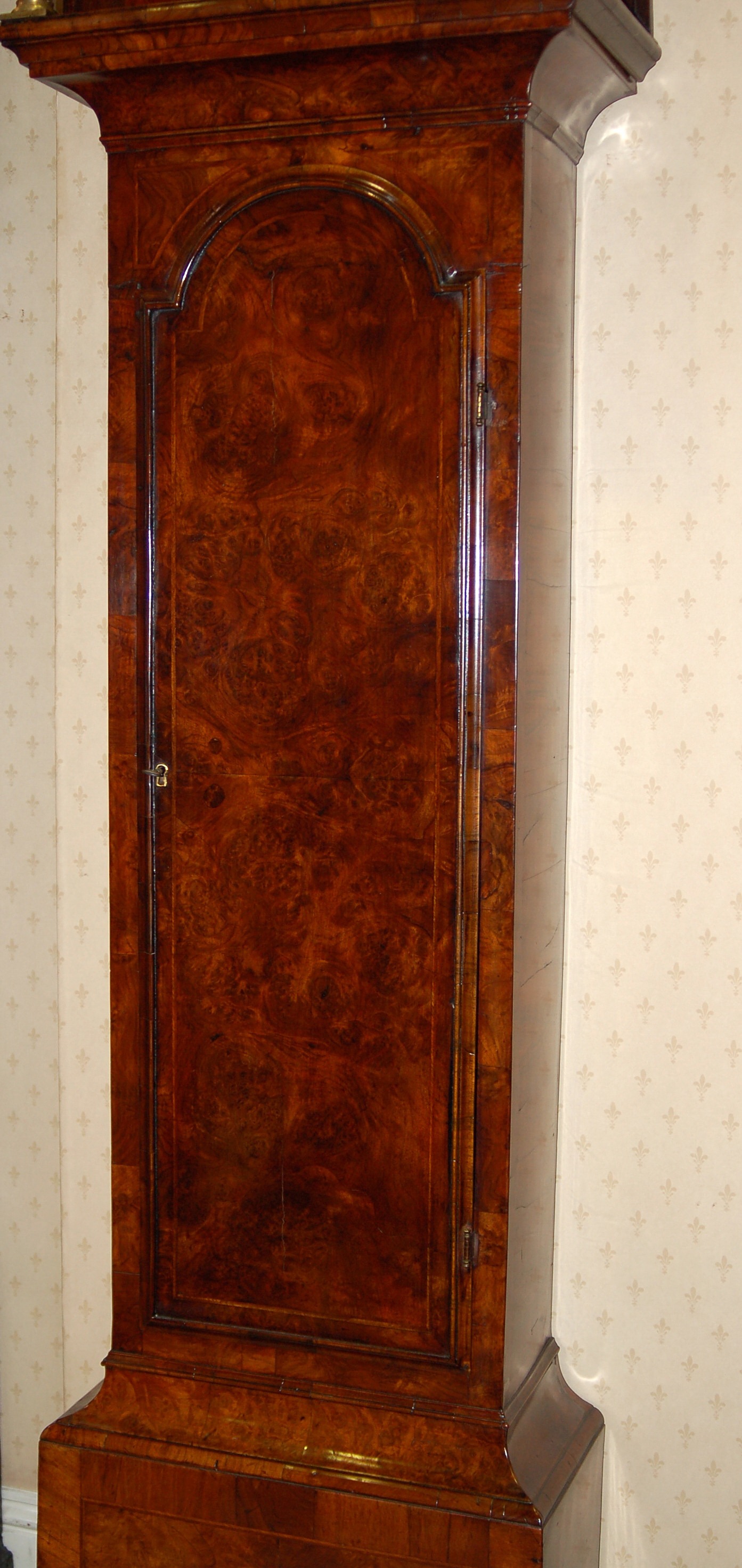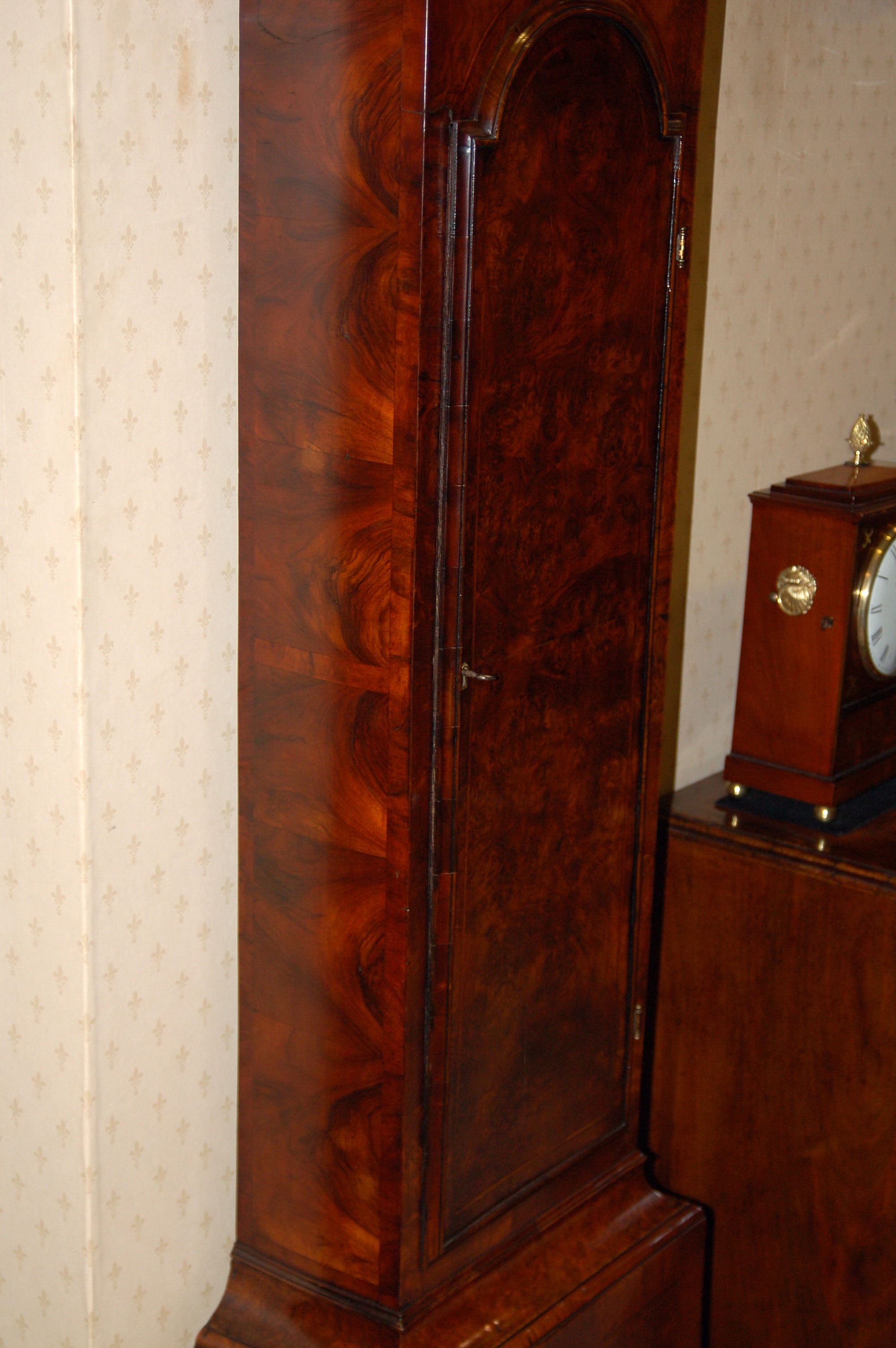 The exceptional quality 5 pillar movement striking the hours on a single bell. The case of the finest choice walnut veneers. Furthermore showing all the typical high quality London case features. Moulding to the trunk door and two plinths. Lovely ‘book matched’ veneers to the trunk and the base to name but a few.