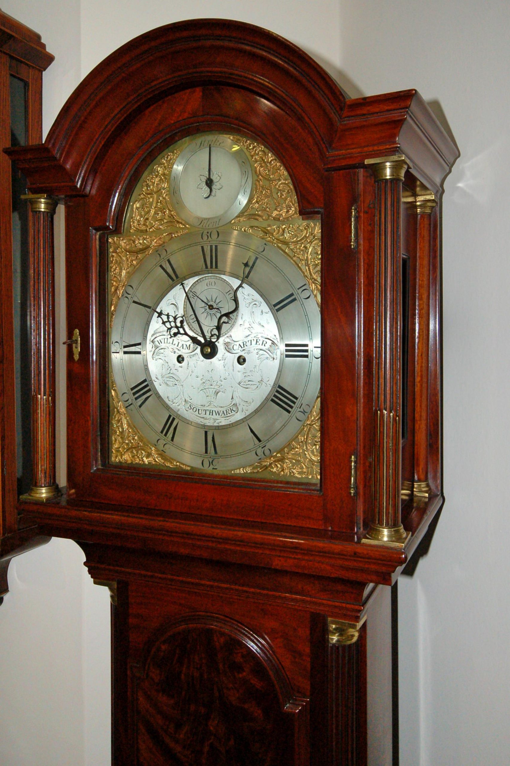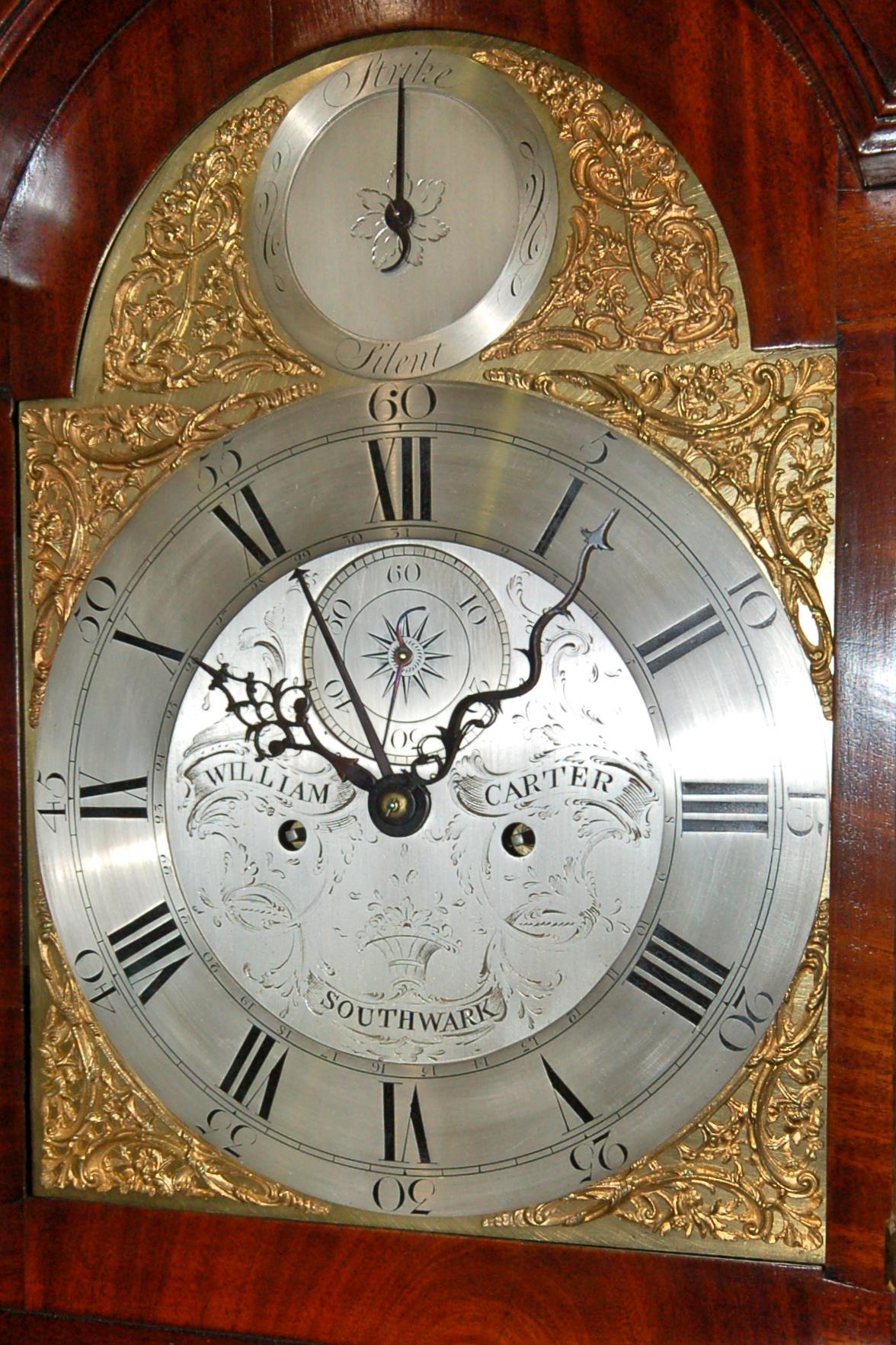 A superb 12 inch arched silvered and engraved chapter ring and spandrels clock by William Carter Southwark (London).