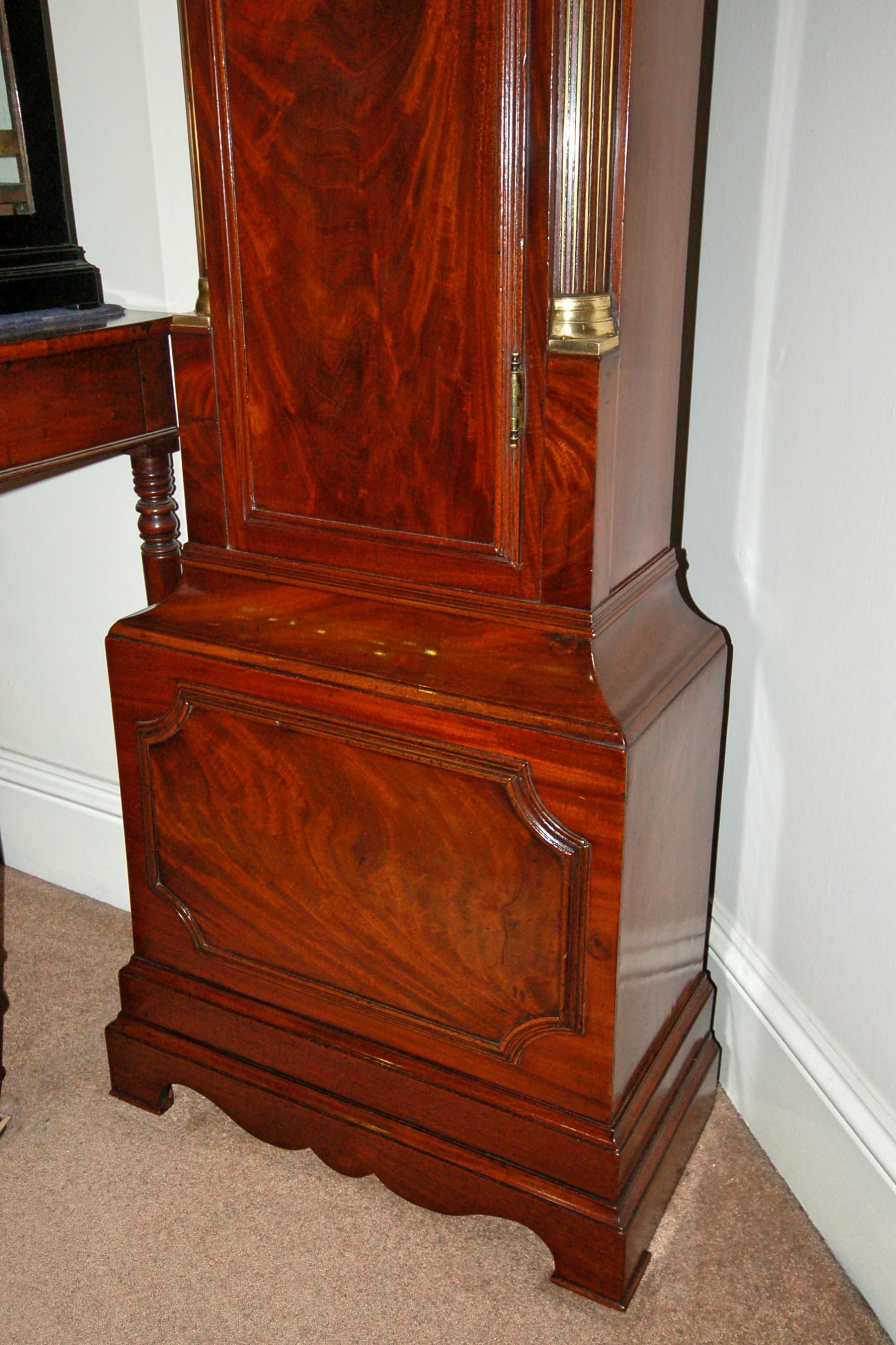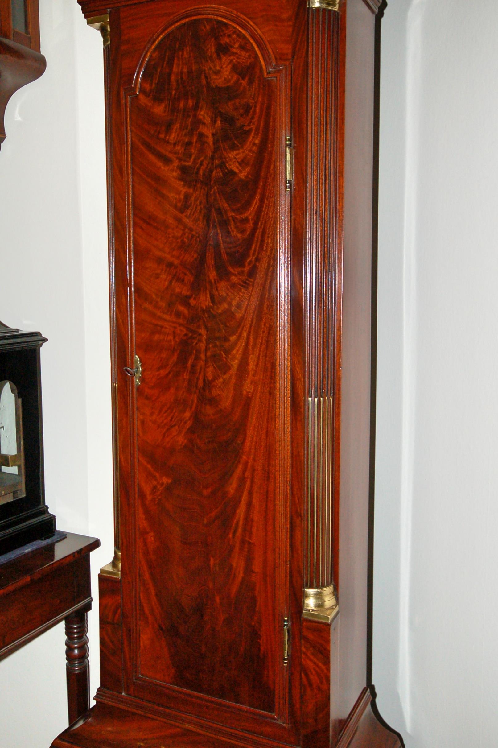 The cabinet with quarter reeded and brass strung columns to the trunk, reeded and brass strung hood columns, moudling to the trunk door and base panel. The clock standing on 2 plinths. Cabinet of lovely colour and patination.