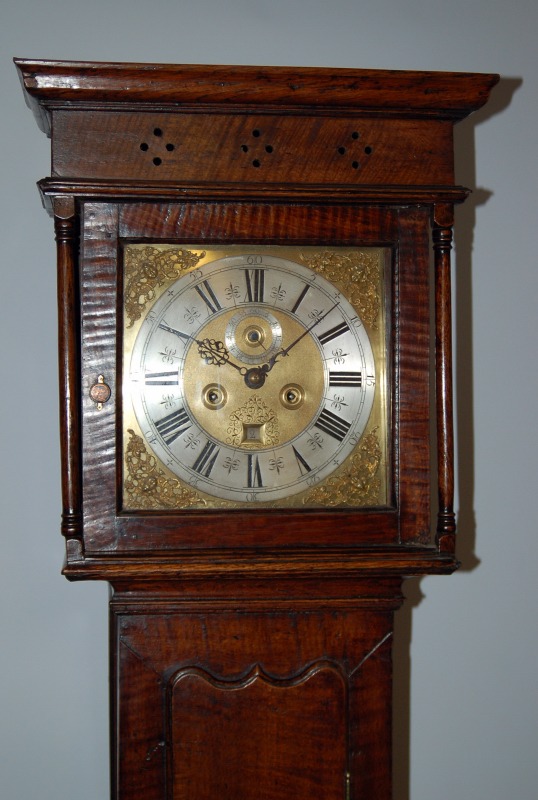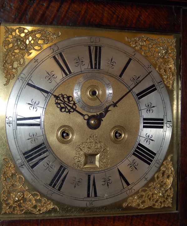 The case of the finest colour and patination. With single plinth and shaped top to the trunk door. Rare mouldings adorned to the side of the case. Holes drilled to the hood to let the sound of the bell out. To sum up a very collectible early clock. The maker is probably related to Francis Robinson of London. He was a famous maker and Master of the Clockmaker’s Company.