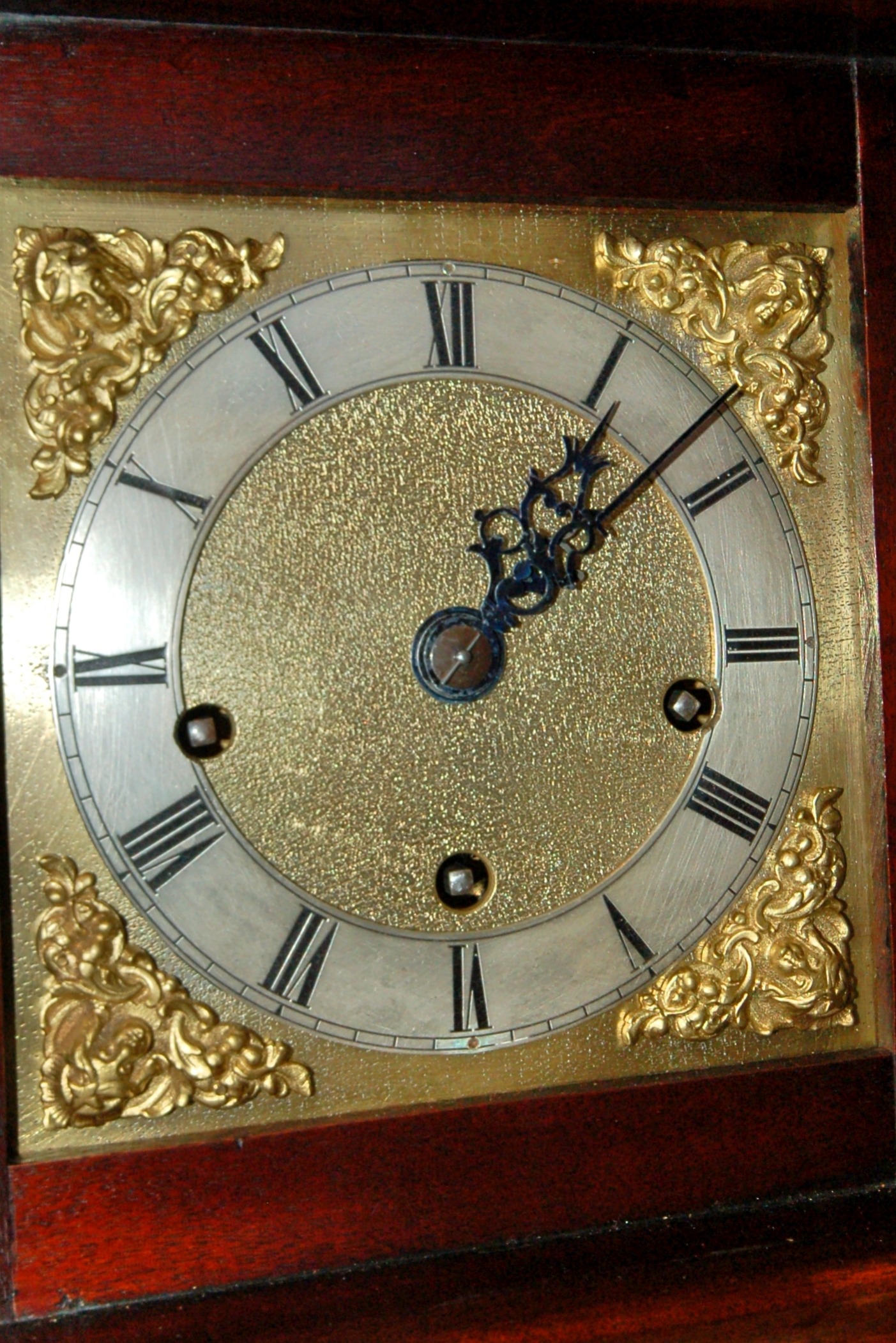 The small size square brass dial with matted centre and spandrels to the corners, silvered chapter ring with Roman numerals.