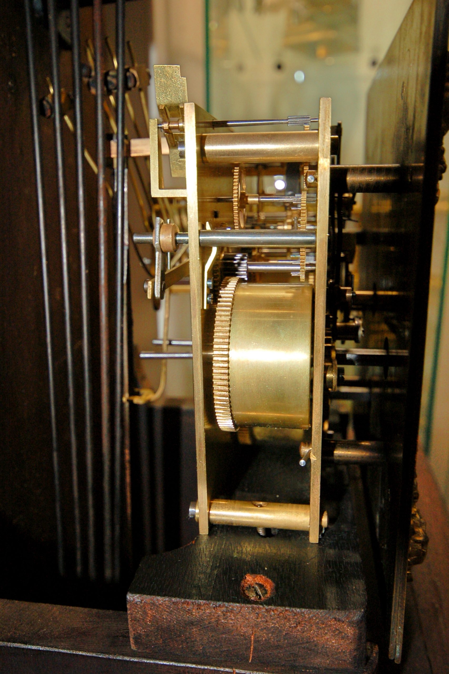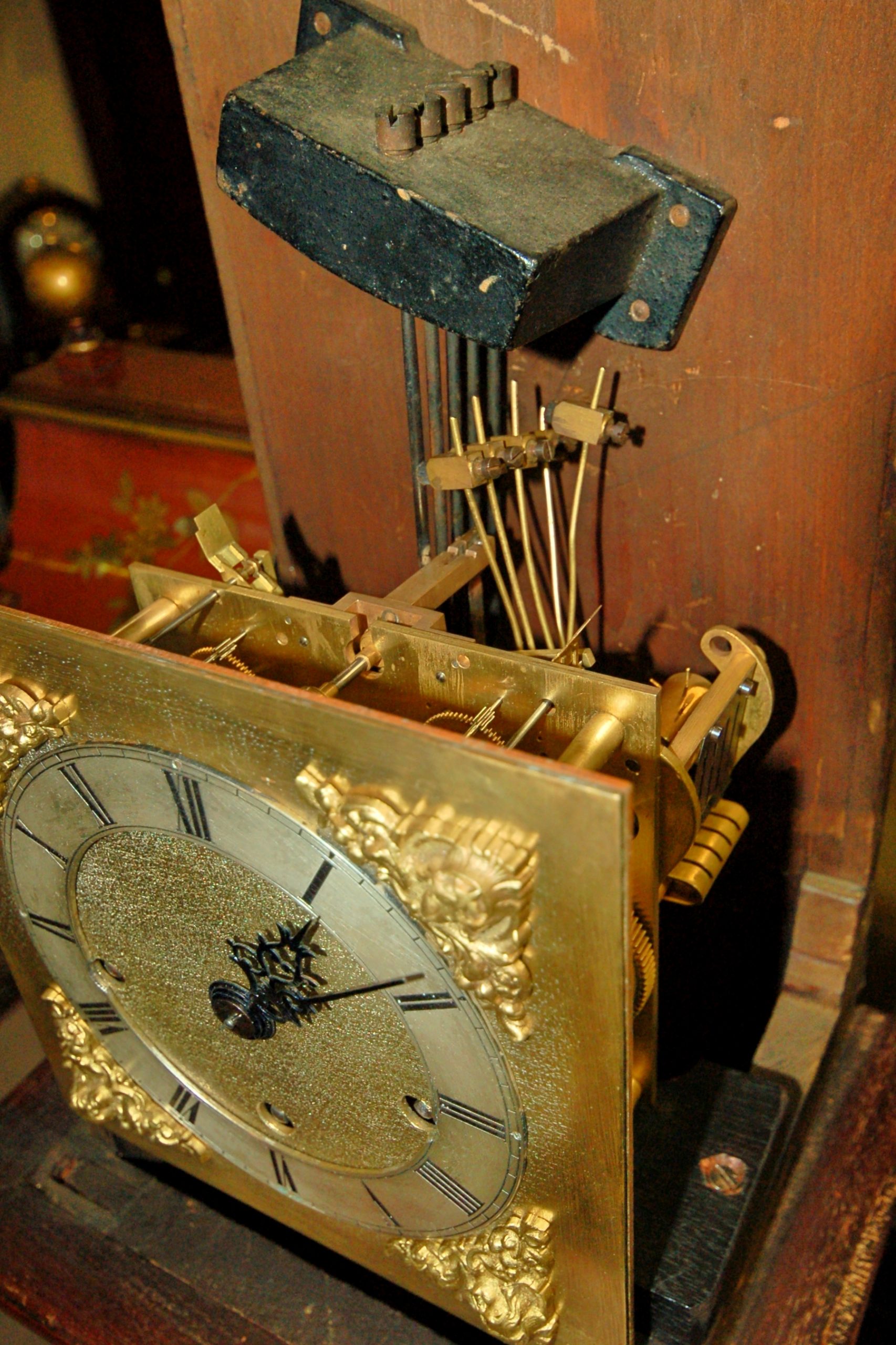 The spring driven movement striking quarters on a series of gongs, the movement being of 8 day duration.