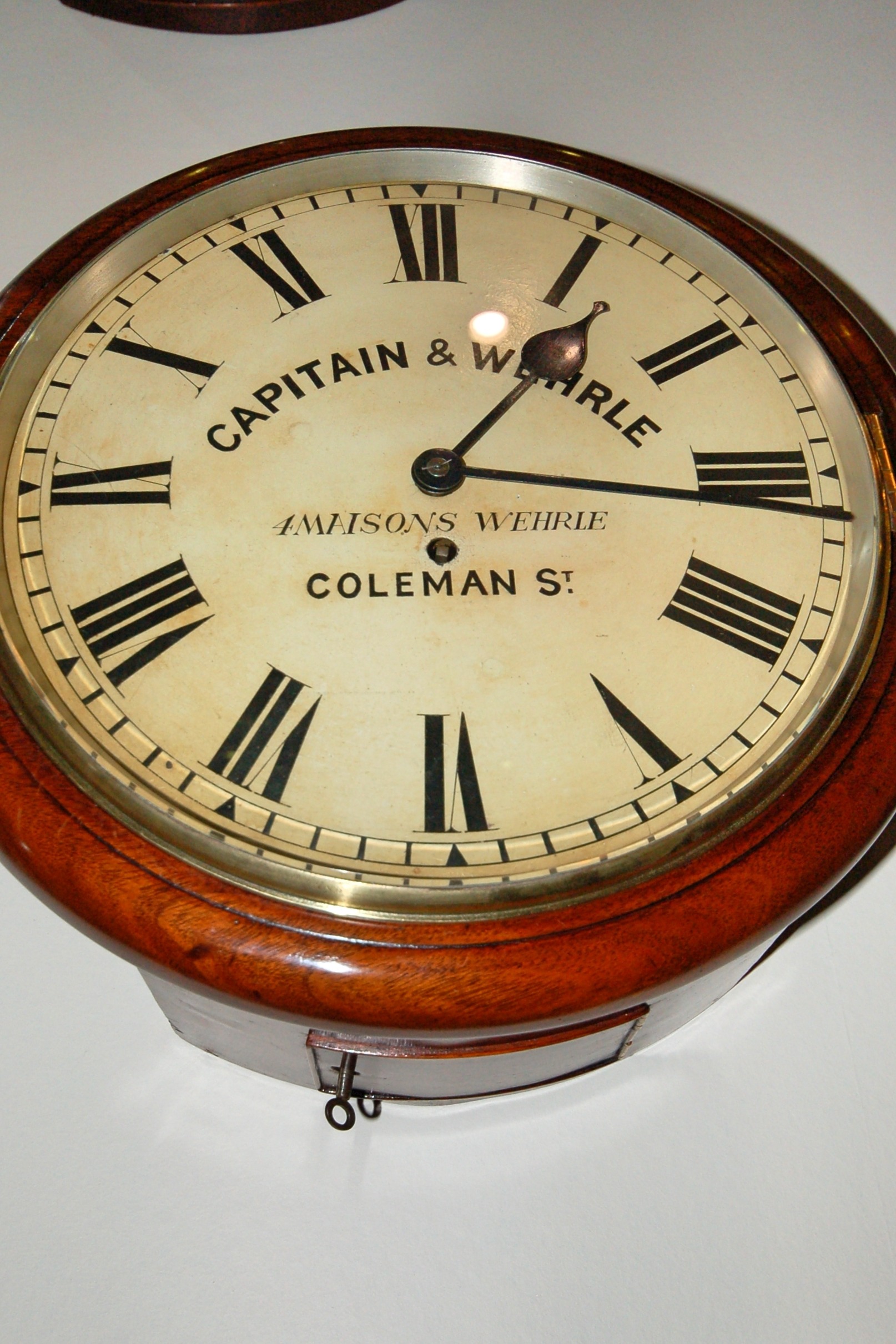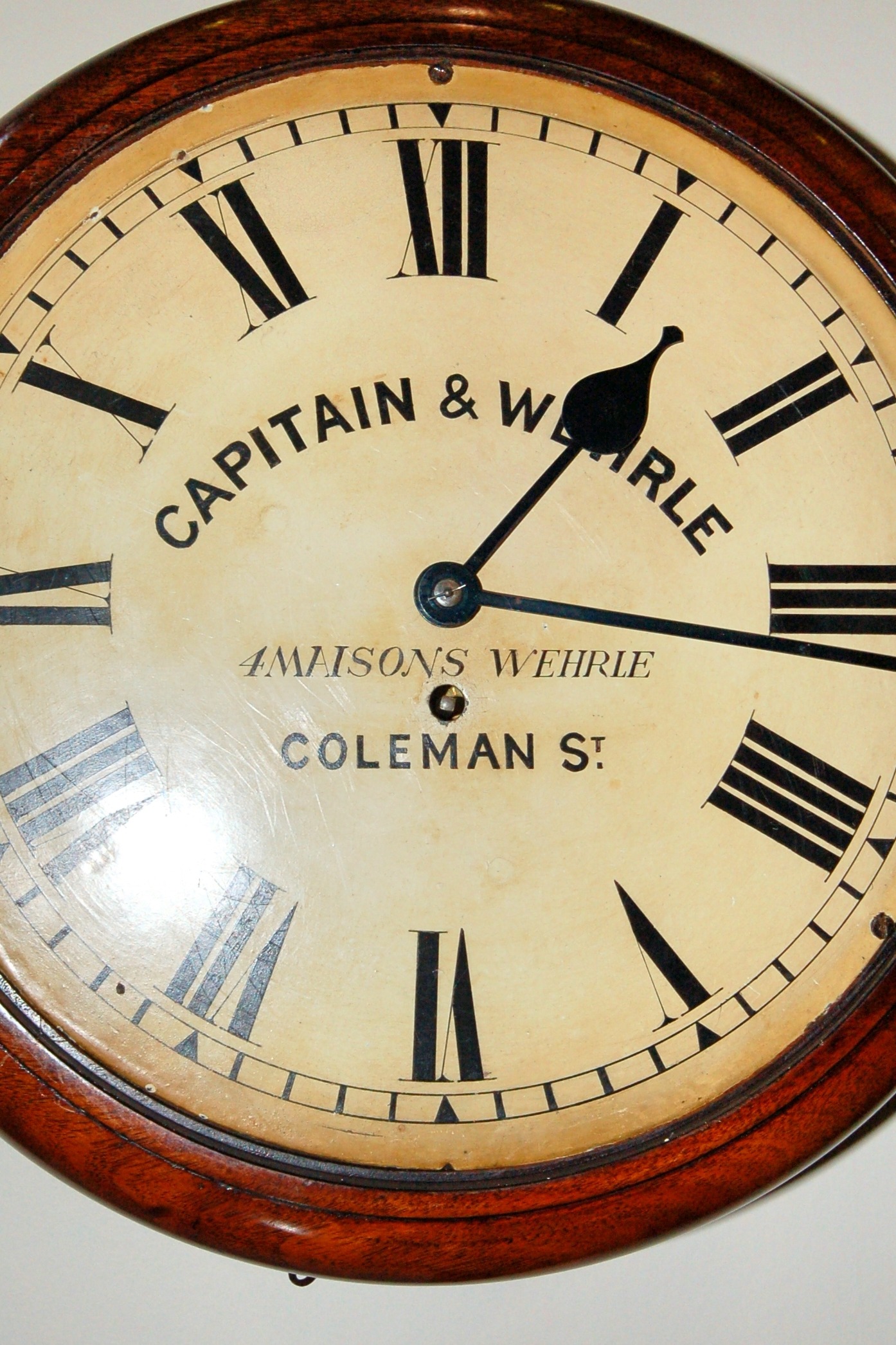Mahogany case with brass bezel surround. 8-day duration fusee timepiece. Capitain & Wehrle of London are recorded as working 1869-1881.