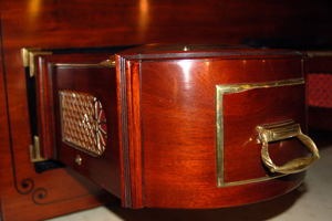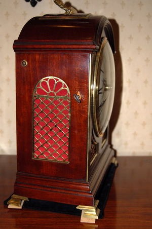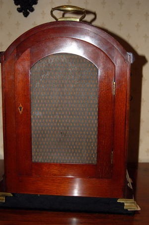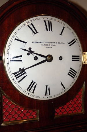 Featuring here a good ‘8-day’ double fusee mahogany bracket clock. Together with round white convex dial. The movement striking hours on a gong. The case also of good design by Goldsmiths & Silversmiths Company of London.