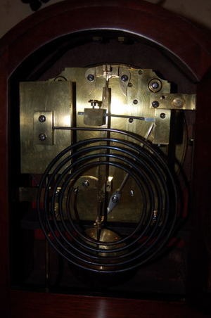 An’8-day’fusee mahogany bracket clock with round white convex dial.