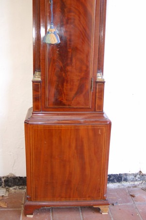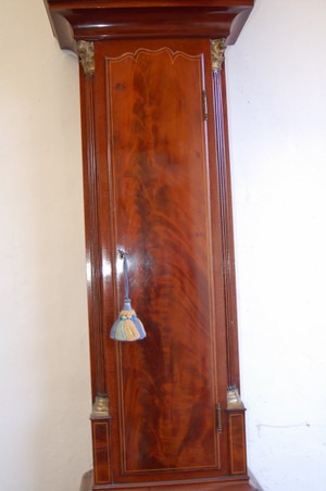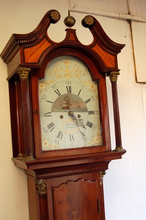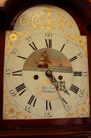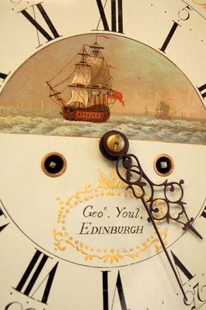 Outstanding ‘8-day’ duration Longcase clock C.1790 by George Youl of Edinburgh. The arched white dial with gold leaf decoration to corners and arch and a ship scene to dial centre. White dial with superbly painted scene. The case of the finest mahogany veneers, boxwood strung.