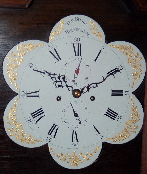 Outstanding petal shaped white dial grandfather clock. Featuring ‘8-day’ oak Longcase clock C.1770 by Thomas Brown of Birmingham. The dial and mask etc in the form of a flower, a real rare clock. The petals of the iron dial with gold leaf spandrel decoration, seconds and calendar to dial centre.