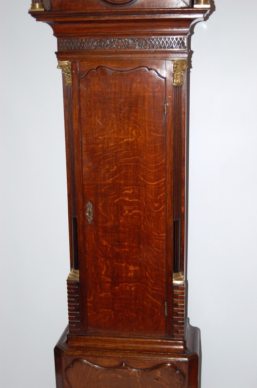 The case showing the finest quality design and the oak cabinet of amazing colour and patination. The hood with reeded columns and swan neck pediments with fretwork below. Additionally reeded trunk sides with brass Corinthian Capitals. Wood brickwork to the trunk section, shaped panel to the base. The clock standing on bracket feet.