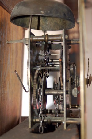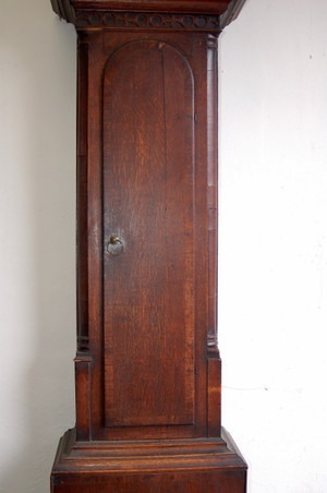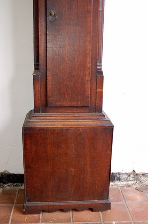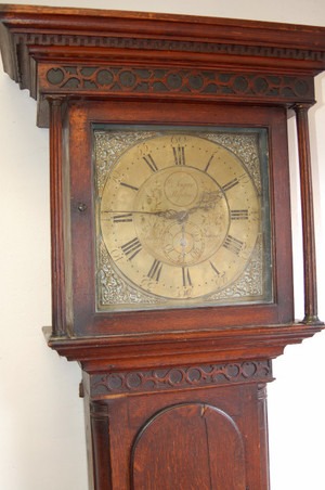 A 30HR oak Longcase clock late 18th century. The brass dial with chapter ring and spandrels and polished and engraved centre with calendar feature.