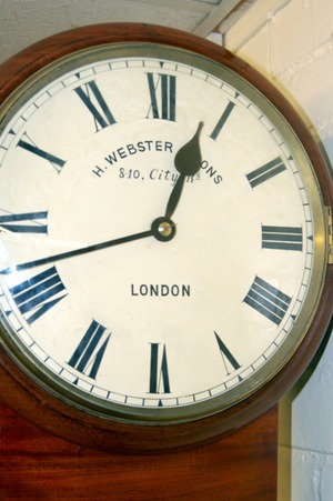 A very rare two sided dial clock. Round painted dials signed Henry Webster and Sons 840 City Road London. On a very nice shaped and decorated wall bracket. Good size clock with cast brass bezel.