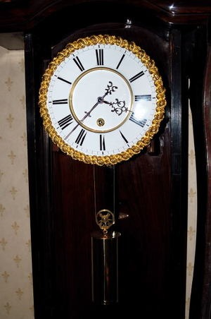 A very elegant rosewood month duration Vienna wall clock. Probably one of the finest you will see of serpentine shape. Here a figure of eight design. Clearly lovely two piece porcelain dial. Also with ‘pie-crust’ brass bezel.