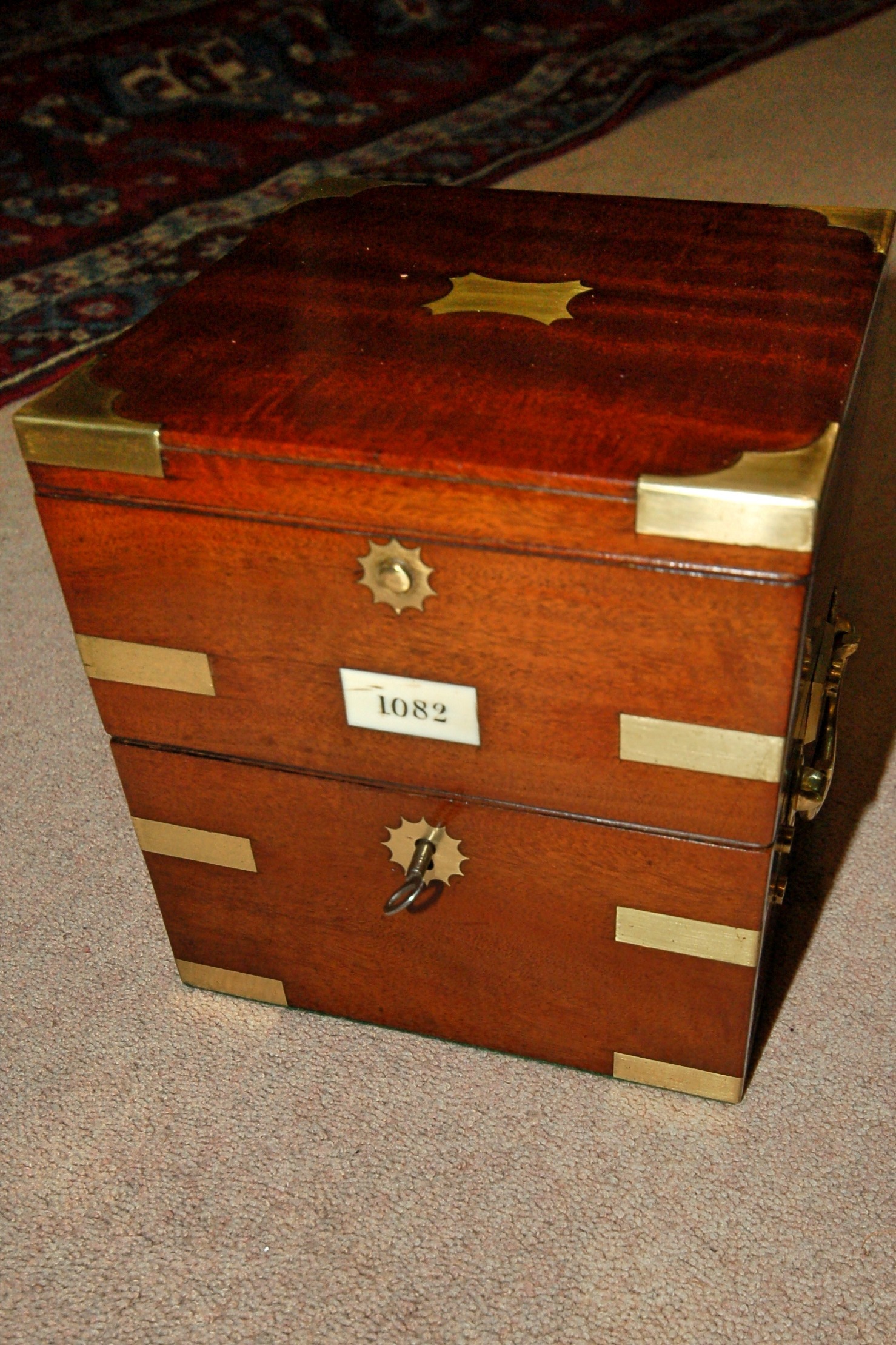 The three tier brass bound mahogany box with bone plaque numbered 1082 and having brass carrying handles. Case 16.5cm wide, 17.7cm high, 16.5cm deep.