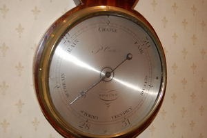 A fine mahogany ‘banjo’ wheel barometer with delicate shell inlay.
